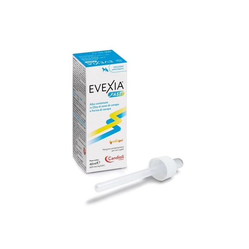 Evexia Fast Gocce è un mangime complementare per cani e gatti, appositamente formulato con un alto contenuto di olio di semi di canapa e farina di canapa. Questa emulsione appetizzata è l'evoluzione di Evexia Plus Gocce e sfrutta le note proprietà benefiche della canapa per offrire un supporto naturale al benessere di cani e gatti.