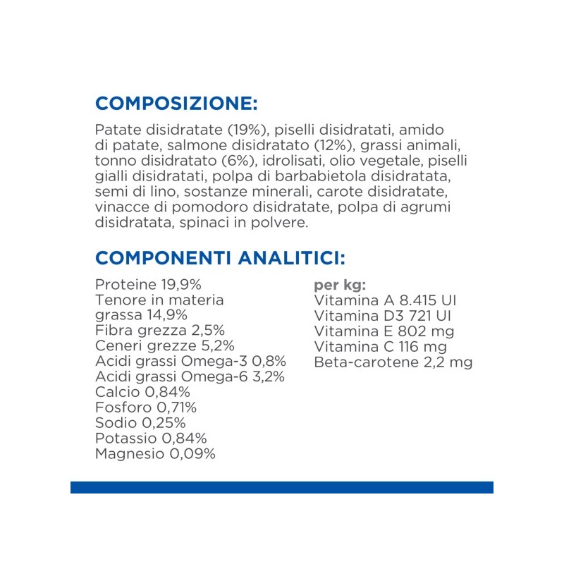 COMPOSIZIONE: Patate disidratate (21%), amido di patate, piselli disidratati, salmone disidratato (9%), proteine del pisello, grasso animale, digest, olio vegetale, minerali, polpa di barbabietola disidratata, semi di lino, carote disidratate, vinacce di pomodoro disidratate, polpa di agrumi disidratata, spinaci in polvere.