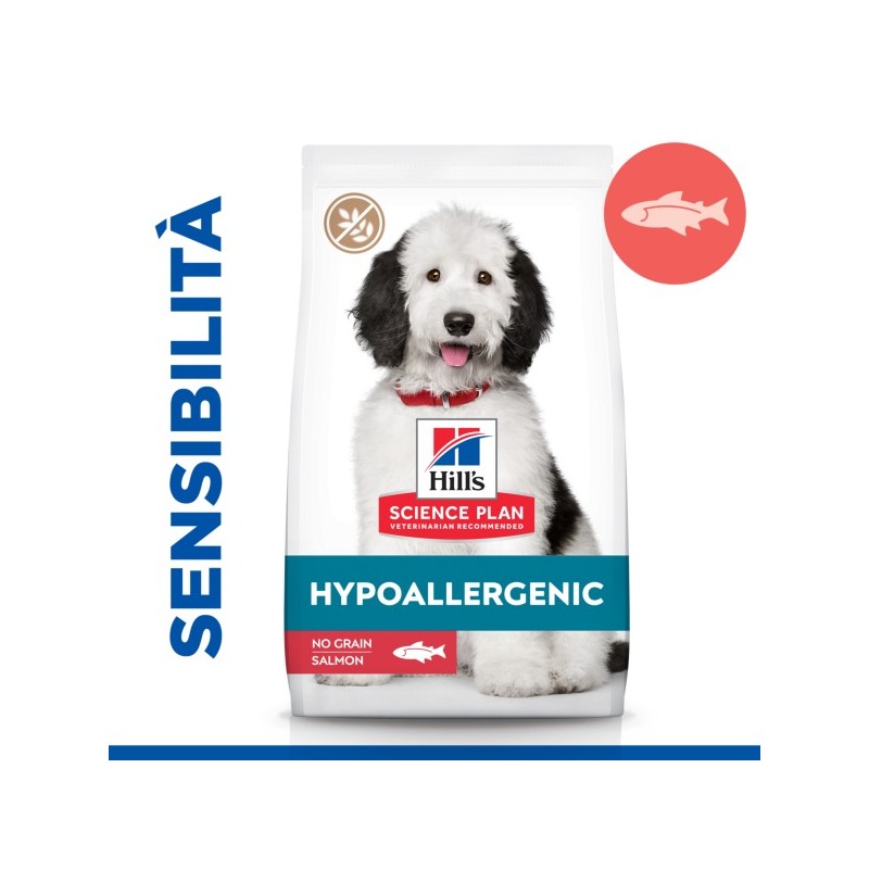 Hill's Science Plan Hypoallergenic Adult Large alimento secco per cani al Salmone è una ricetta delicata formulata con un numero limitato di fonti proteiche di alta qualità senza cereali, pensato per soddisfare le esigenze dei cani con sensibilità.