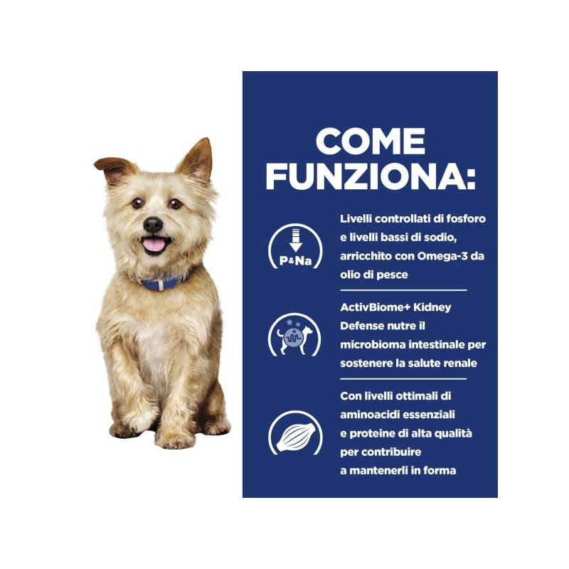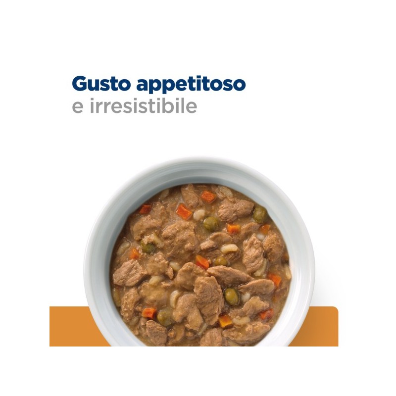 Quando i cani hanno danni al tessuto renale, i reni non possono funzionare come prima. La condizione non è reversibile, ma la progressione può essere rallentata. Gli alimenti dietetici per le malattie renali sono progettati per aiutare a ridurre il carico di lavoro sui reni, consentendo loro di funzionare in modo più efficace. I cani con ridotta funzionalità renale possono manifestare perdita di appetito e l'assunzione di alimento potrebbe diminuire. I nutrizionisti e i veterinari di Hill's hanno sviluppato la nutrizione clinica Hill's Prescription Diet k/d con ActivBiome+ Kidney Defense, una miscela brevettata di prebiotici che ha dimostrato di nutrire il microbioma intestinale per aiutare a sostenere la funzione renale. Questo spezzatino è fatto con pollo e verdure aggiunte e ha un gusto irresistibile che il tuo cane adorerà. In effetti, Prescription Diet k /d è un alimento clinicamente testato per migliorare e prolungare la qualità della vita.