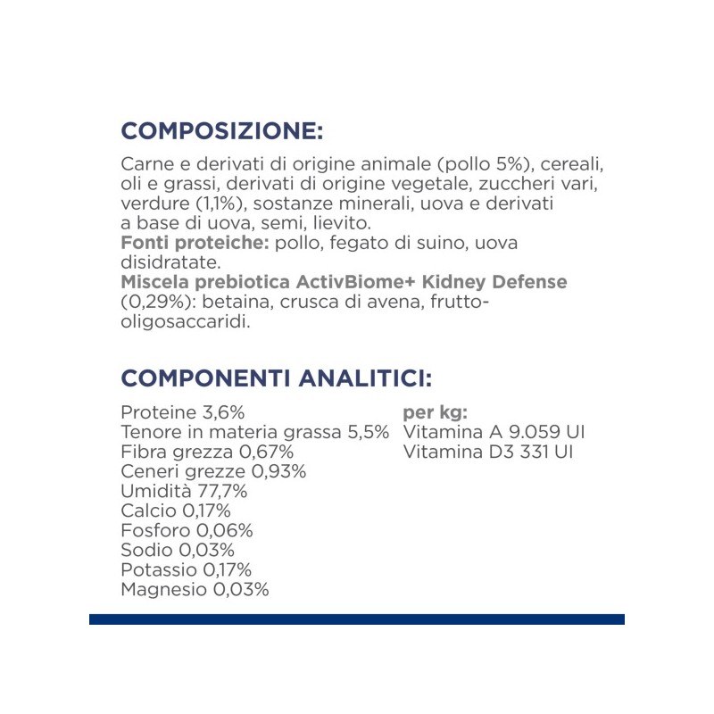 COMPOSIZIONE: Carne e derivati di origine animale (pollo 5%), cereali, oli e grassi, derivati di origine vegetale, zuccheri vari, verdure (1,1%), minerali, uova e derivati, semi, lieviti. Miscela prebiotica ActivBiome+ Kidney Defense (0,29%): betaina, crusca d'avena, frutto-oligosaccaridi. Fonti proteiche: pollo, fegato di suino, uova disidratate.