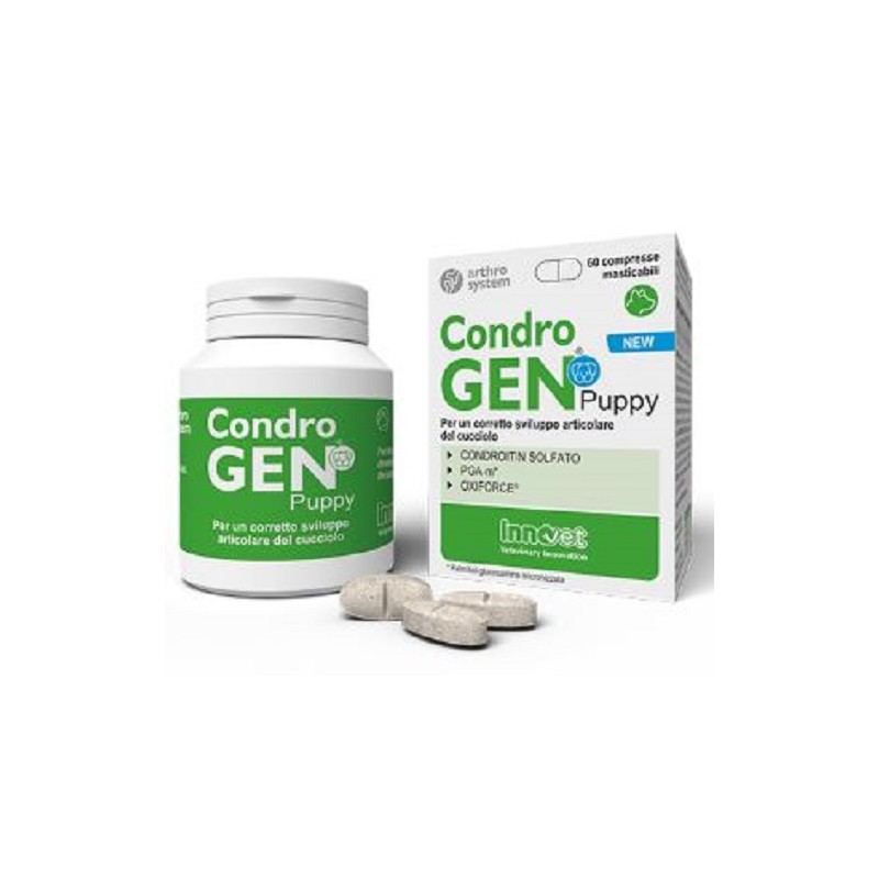 Condrogen® puppy contribuisce al corretto sviluppo muscolo-scheletrico dei cuccioli di ogni età. È particolarmente indicato per proteggere e rinforzare le articolazioni dei soggetti di taglia grande/gigante o appartenenti alle razze predisposte a problemi articolari (es. displasie). Trova utile impiego anche nei giovani/adulti sottoposti ad intenso carico articolare (es. cani sportivi, da lavoro o in sovrappeso). Condrogen® 3.0 non è un farmaco veterinario, ma un alimento complementare per cani Somministrare direttamente in bocca o mescolato al cibo per periodi di 60 – 90 gg, alla dose quotidiana. Al termine di un ciclo di somministrazione continuata, Condrogen® Energy può essere sospeso per un periodo compreso tra 30 e 60 giorni.