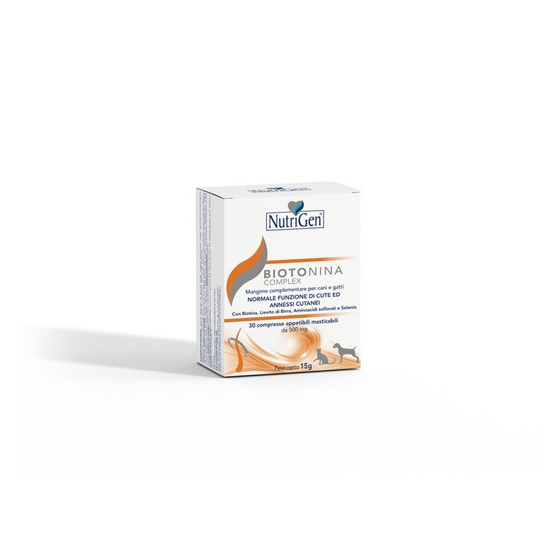 BIOTONINA COMPLEX è un mangime complementare per cani e gatti formulato in compresse appetibili con Biotina, lievito di birra, aminoacidi solforati (D,L-Metionina, L-Cistina) e Seleniometionina, fonte di Selenio, per favorire la normale funzione di cute ed annessi cutanei (pelo ed unghie). BIOTONINA COMPLEX risulta particolarmente utile nei periodi di muta supportando il normale processo di ricambio del pelo.