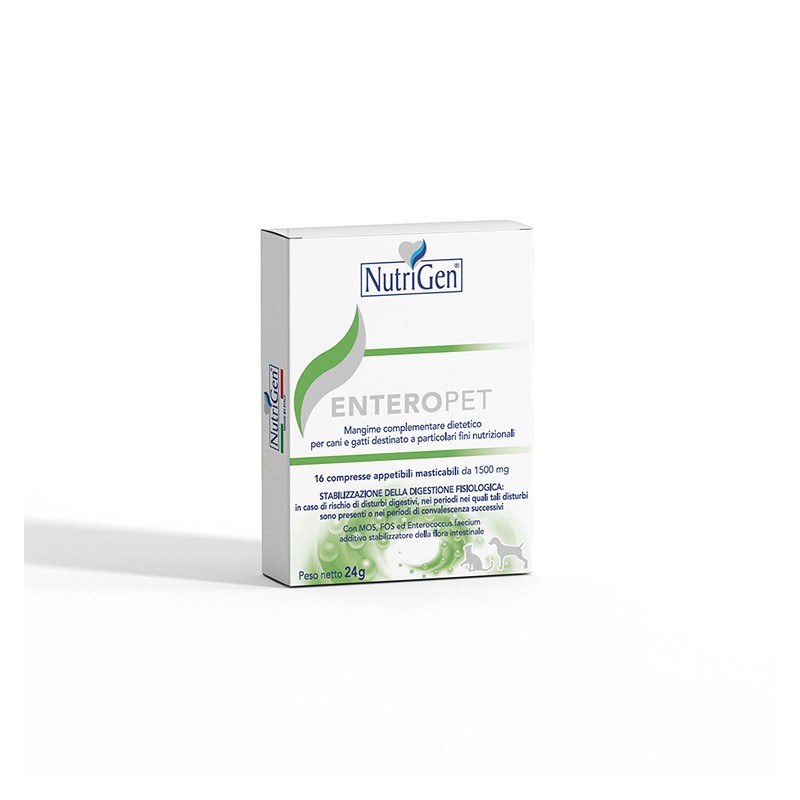 ENTEROPET è un mangime complementare dietetico in compresse appetibili per cani e gatti destinato a particolari fini nutrizionali, formulato con Mannanoligosaccaridi (MOS), Fruttoligosaccaridi (FOS) ed Enterococcus faecium DSM 10663-NCIMB 10415 come additivo stabilizzatore della flora intestinale ad azione favorevole sulla stabilizzazione della digestione fisiologica in caso di rischio di disturbi digestivi e periodi nei quali tali disturbi sono presenti. Enterococcus faecium favorisce il normale equilibrio della flora batterica intestinale.