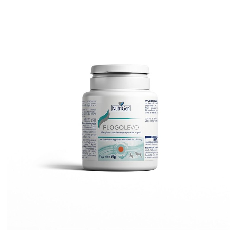 FLOGOLEVO è un mangime complementare per cani e gatti formulato in compresse appetibili con estratto di Curcuma in matrice fosfolipidica e Betacariofillene.