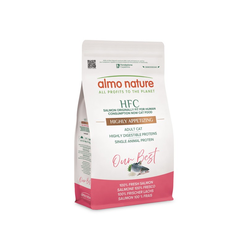 Le crocchette HFC Our Best Highly Appetizing sono preparate con salmone 100% fresco e nutrizionalmente complete per l’alimentazione quotidiana dei gatti adulti più esigenti.Our Best perché la nostra crocchetta HFC è preparata con pesce in origine idoneo al consumo umano ora alimento per gatti per scelta commerciale, la qualità che scegli per te.Il salmone utilizzato è fresco al 100% quindi non è stato sottoposto ad un trattamento termico precedente, come invece accade per le farine e disidratati animali. Subendoquindi un solo processo di cottura si preservano meglio i nutrienti del pesce per proteine altamente biodisponibili e digeribili. La ricetta è monoproteica, senza glutine econtribuisce alla normale funzionalità intestinale. HFC Our Best Highly Appetizing garantisce un'altissima appetibilità naturale per quei gatti esigenti che non si accontentanodel “solito pasto”. Il salmone fresco, grazie al suo profilo lipidico unico e ricco di acidi grassi Omega-3 naturali, stimola l'appetito e rende le crocchette ideali anche per gatti coninappetenza. Almo Nature suggerisce di servire alimenti umidi e secchi e alternare fonti proteiche differenti per assicurare una alimentazione varia.HFC Our Best Highly Appetizing è disponibile in sacchi da 300g e 1,2 kg.Almo Nature è il brand attivista 100% proprietà della Fondazione Capellino.