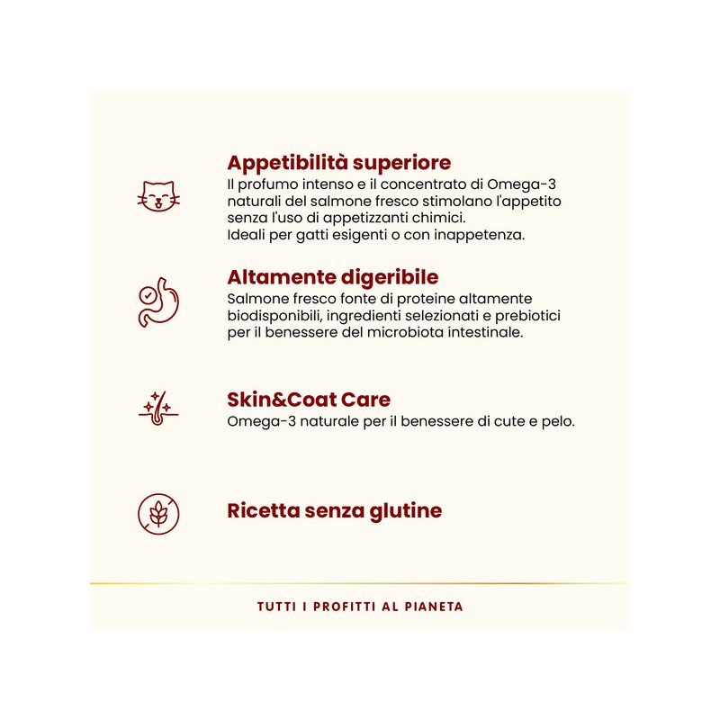 Salmone fresco* 50%, riso 26%, proteine animali idrolizzate, proteina di patate, lieviti, grasso di pollo**, sostanze minerali, inulina di cicoria (fonte di FOS) 0,1%, mannano-oligo-saccaridi 0,1%, Yucca schidigera 0,01%. *Fonte naturale di omega 3. **Non contiene proteine di pollo.