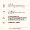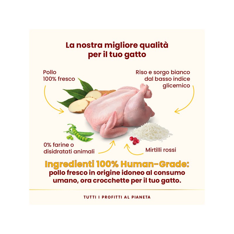 Pollo fresco 40%, riso 14%, proteine animali idrolizzate, sorgo bianco 8,5%, proteina di patate, piselli 7,1%, polpa di barbabietola 2,8%, sostanze minerali, grasso di pollo, amido di piselli, lieviti, mirtillo rosso disidratato 0,92%, olio di salmone, inulina di cicoria (fonte di FOS) 0,1%, mannano-oligo-saccaridi 0,1%, Yucca schidigera 0,01%.