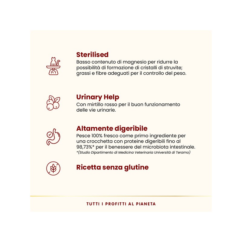 Spigola fresca* 25%, orata fresca* 25%, riso 11,7%, sorgo bianco 6,5%, lieviti, proteina di patate, piselli 5,2%, polpa di barbabietola 4,1%, proteine animali idrolizzate, farina di riso integrale, grasso di pollo**, mirtillo rosso disidratato 0,92%, sostanze minerali, inulina di cicoria (fonte di FOS) 0,1%, mannano-oligo-saccaridi 0,1%, Yucca schidigera 0,01%. *Fonte naturale di omega 3. **Non contiene proteine di pollo.