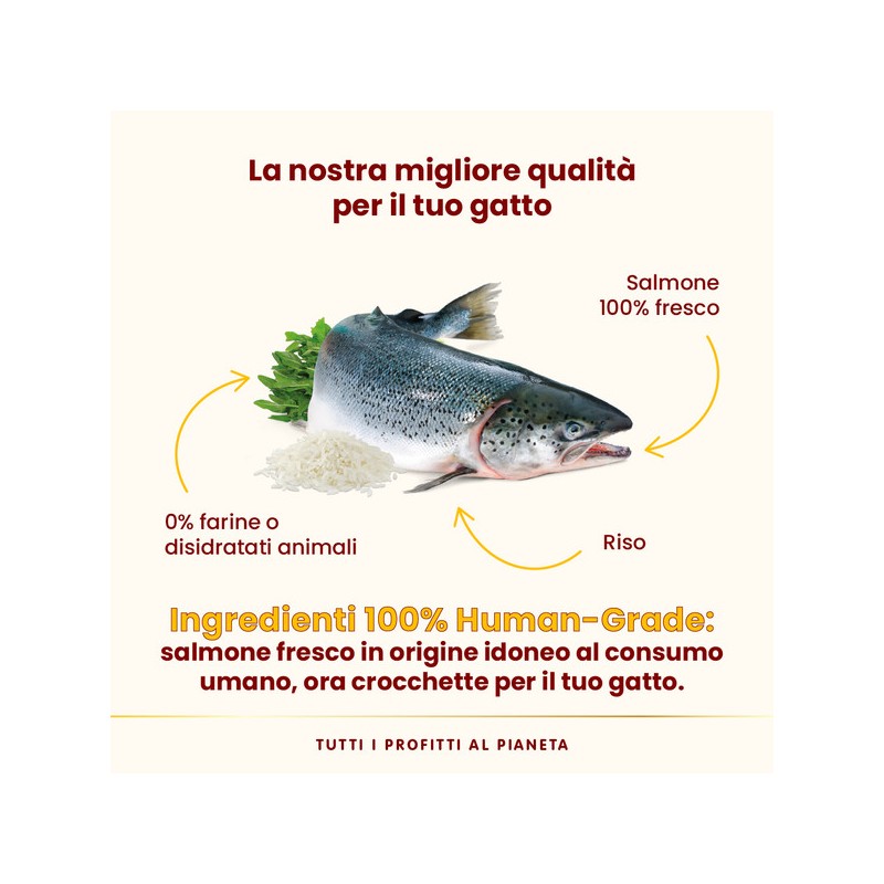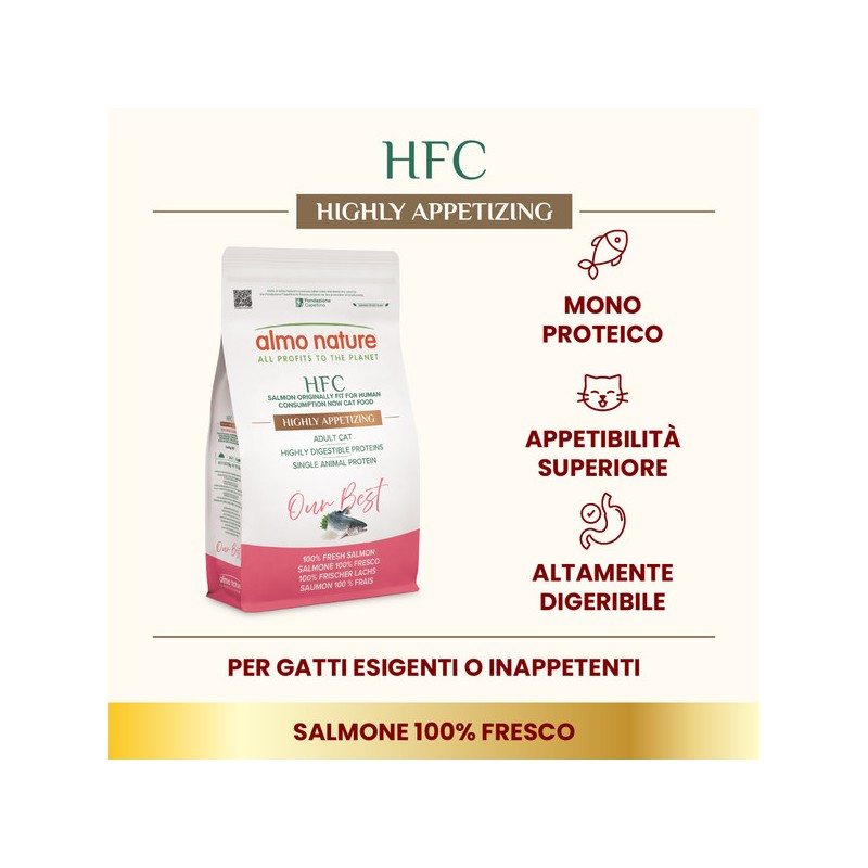 Le crocchette HFC Our Best Highly Appetizing sono preparate con salmone 100% fresco e nutrizionalmente complete per l’alimentazione quotidiana dei gatti adulti più esigenti.Our Best perché la nostra crocchetta HFC è preparata con pesce in origine idoneo al consumo umano ora alimento per gatti per scelta commerciale, la qualità che scegli per te.Il salmone utilizzato è fresco al 100% quindi non è stato sottoposto ad un trattamento termico precedente, come invece accade per le farine e disidratati animali. Subendoquindi un solo processo di cottura si preservano meglio i nutrienti del pesce per proteine altamente biodisponibili e digeribili. La ricetta è monoproteica, senza glutine econtribuisce alla normale funzionalità intestinale. HFC Our Best Highly Appetizing garantisce un'altissima appetibilità naturale per quei gatti esigenti che non si accontentanodel “solito pasto”. Il salmone fresco, grazie al suo profilo lipidico unico e ricco di acidi grassi Omega-3 naturali, stimola l'appetito e rende le crocchette ideali anche per gatti coninappetenza. Almo Nature suggerisce di servire alimenti umidi e secchi e alternare fonti proteiche differenti per assicurare una alimentazione varia.HFC Our Best Highly Appetizing è disponibile in sacchi da 300g e 1,2 kg.Almo Nature è il brand attivista 100% proprietà della Fondazione Capellino.