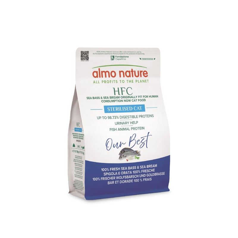 Le crocchette HFC Our Best Sterilised sono preparate con carne o pesce 100% freschi e nutrizionalmente complete per l’alimentazione quotidiana dei gatti adulti e maturi. Our Best perché la nostra crocchetta HFC è preparata con carne o pesce in origine idonei al consumo umano ora alimento per gatti per scelta commerciale, la qualità che scegli per te. La carne o il pesce utilizzati sono freschi al 100% quindi non sono stati sottoposti ad un trattamento termico precedente, come invece accade per le farine e disidratati animali. Subendo quindi un solo processo di cottura si preservano meglio i nutrienti della carne o del pesce per proteine altamente biodisponibili e digeribili. Le crocchette HFC Our Best contribuiscono quindi al normale funzionamento intestinale e forniscono proteine digeribili fino al 98,73%*. La ricetta è senza glutine, con sorgo bianco a basso indice glicemico, HFC Our Best Sterilised è ideale per gatti sterilizzati grazie al basso contenuto di magnesio e la presenza del mirtillo rosso contribuisce al buon funzionamento delle vie urinarie. Crocchette disponibili sia in versione monoproteica che non, senza farine o disidratati di carne o pesce. Almo Nature suggerisce di servire alimenti umidi e secchi e alternare fonti proteiche differenti per assicurare una alimentazione varia. HFC Our Best Sterilised – 3 ricette di crocchette per gatti adulti, sterilizzati e non – disponibile in sacchi da 300g e 1,2 kg. Almo Nature è il brand attivista 100% proprietà della Fondazione Capellino. *Studio del Dipartimento di Medicina Veterinaria, Università di Teramo.