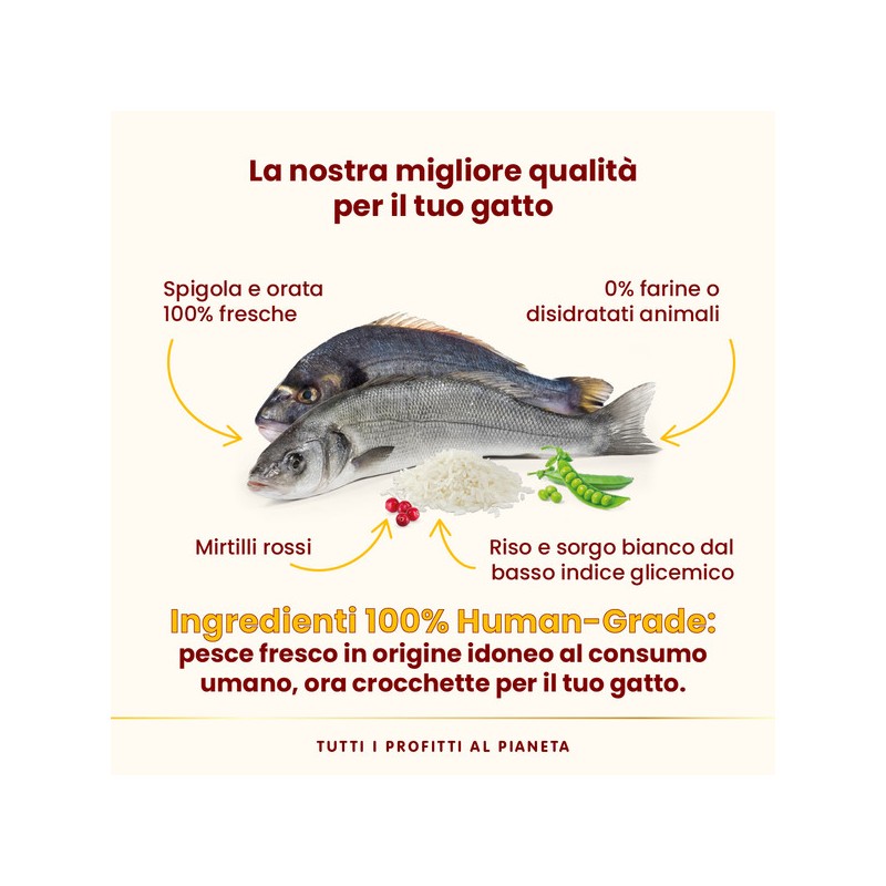 Spigola fresca* 25%, orata fresca* 25%, riso 11,7%, sorgo bianco 6,5%, lieviti, proteina di patate, piselli 5,2%, polpa di barbabietola 4,1%, proteine animali idrolizzate, farina di riso integrale, grasso di pollo**, mirtillo rosso disidratato 0,92%, sostanze minerali, inulina di cicoria (fonte di FOS) 0,1%, mannano-oligo-saccaridi 0,1%, Yucca schidigera 0,01%. *Fonte naturale di omega 3. **Non contiene proteine di pollo.
