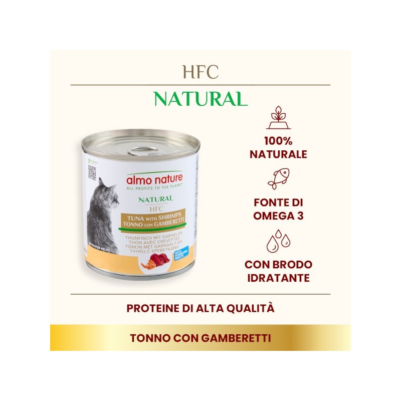 Con ingredienti HFC, cioè in origine idonei al consumo umano, ora alimento per gatti. HFC Natural – la lattina più famosa di Almo Nature e la sua ricetta tradizionale.