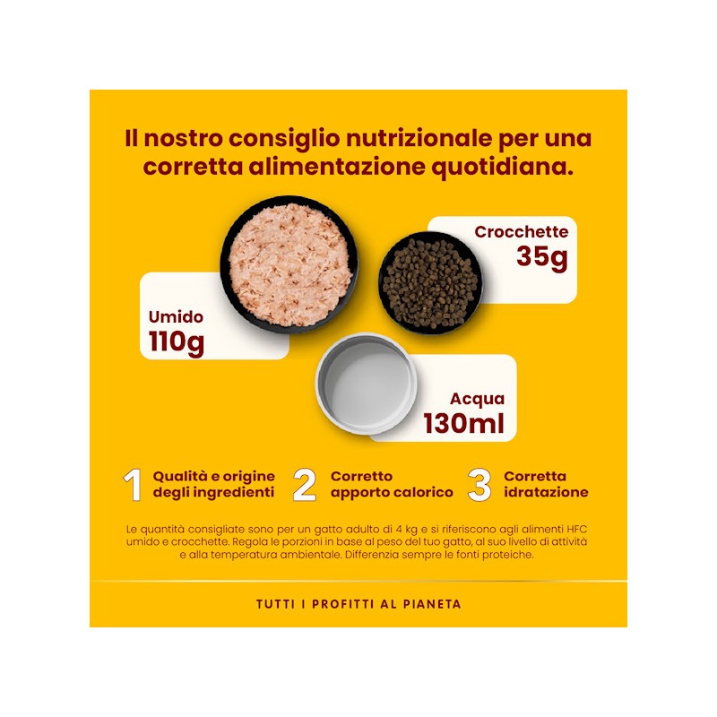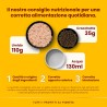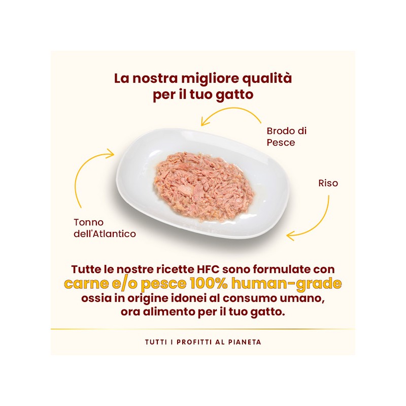 Composizione: tonno dellìAtlantico 55%, brodo di pesce 42%, riso 3%. Componenti analitici: proteina grezza 15%, fibra grezza 0,1%, oli e grassi grezzi 0,5%, ceneri grezze 1%, umidità 83%. 560 kcal/kg.