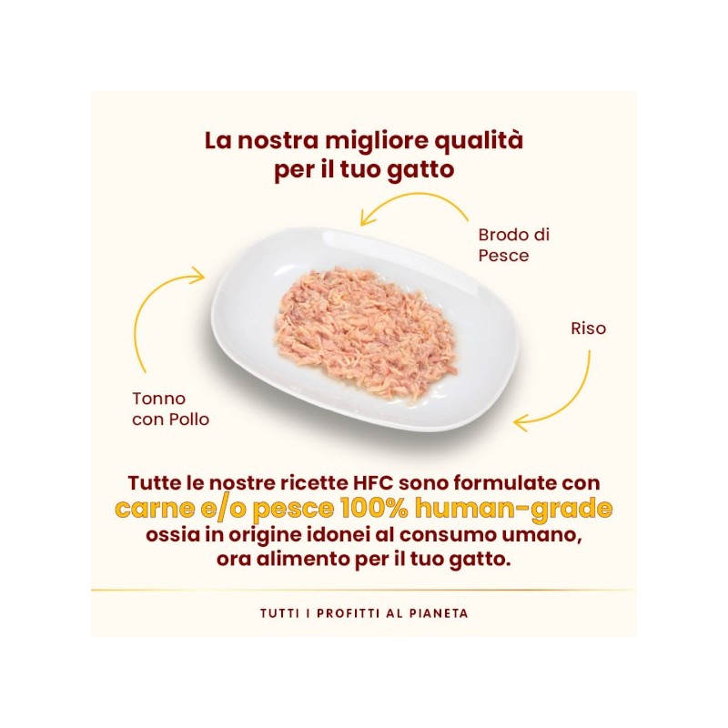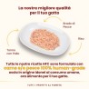 Composizione: tonno min. 38%, pollo min. 12%, acqua di cottura, riso 3%. Componenti analitici: proteina grezza 13%, fibra grezza 0,1%, oli e grassi grezzi 0,1%, ceneri grezze 2%, umidità 83%. 463 kcal/kg.