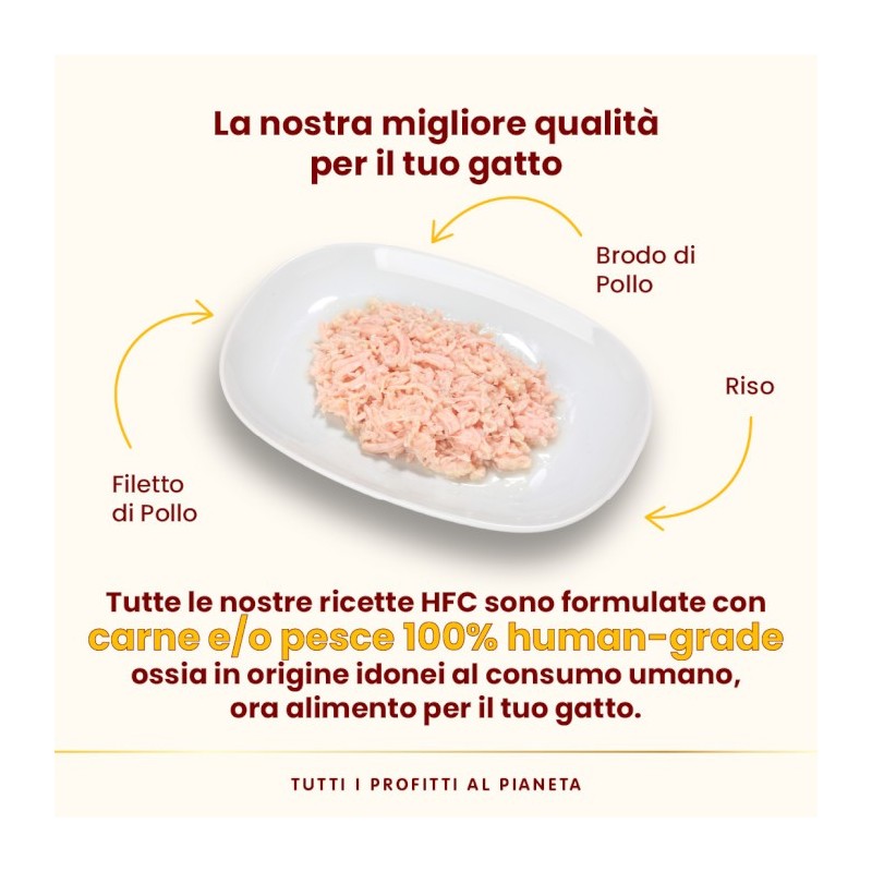 La linea HFC Natural è preparata con ingredienti HFC, cioè in origine idonei al consumo umano e ora utilizzati nei nostri alimenti per gatti. La garanzia che sceglieresti per te. Una ampia gamma di alimenti umidi complementari preparati con il 75% di carne o pesce HFC. Cucinate semplicemente in brodo di cottura, le ricette HFC Natural sono ideali per idratare naturalmente il tuo gatto. Almo Nature suggerisce di alternare le diverse fonti proteiche per assicurare una alimentazione varia e soddisfare i gusti di tutti i gatti, anche quelli più esigenti! La confezione in latta e l'etichetta in carta sono entrambe riciclabili e, se smaltite correttamente, possono essere riutilizzate come materia prima per altri imballi. HFC Natural – deliziosi filettini di carne o pesce HFC in brodo – disponibili in lattine da 70 g. Almo Nature è il brand attivista 100% proprietà della Fondazione Capellino.