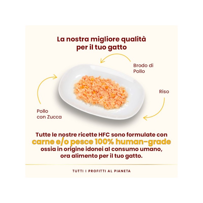 La linea HFC Natural è preparata con ingredienti HFC, cioè in origine idonei al consumo umano e ora utilizzati nei nostri alimenti per gatti. La garanzia che sceglieresti per te. Una ampia gamma di alimenti umidi complementari preparati con il 75% di carne o pesce HFC. Cucinate semplicemente in brodo di cottura, le ricette HFC Natural sono ideali per idratare naturalmente il tuo gatto. Almo Nature suggerisce di alternare le diverse fonti proteiche per assicurare una alimentazione varia e soddisfare i gusti di tutti i gatti, anche quelli più esigenti! La confezione in latta e l'etichetta in carta sono entrambe riciclabili e, se smaltite correttamente, possono essere riutilizzate come materia prima per altri imballi. HFC Natural – deliziosi filettini di carne o pesce HFC in brodo – disponibili in lattine da 70 g. Almo Nature è il brand attivista 100% proprietà della Fondazione Capellino.