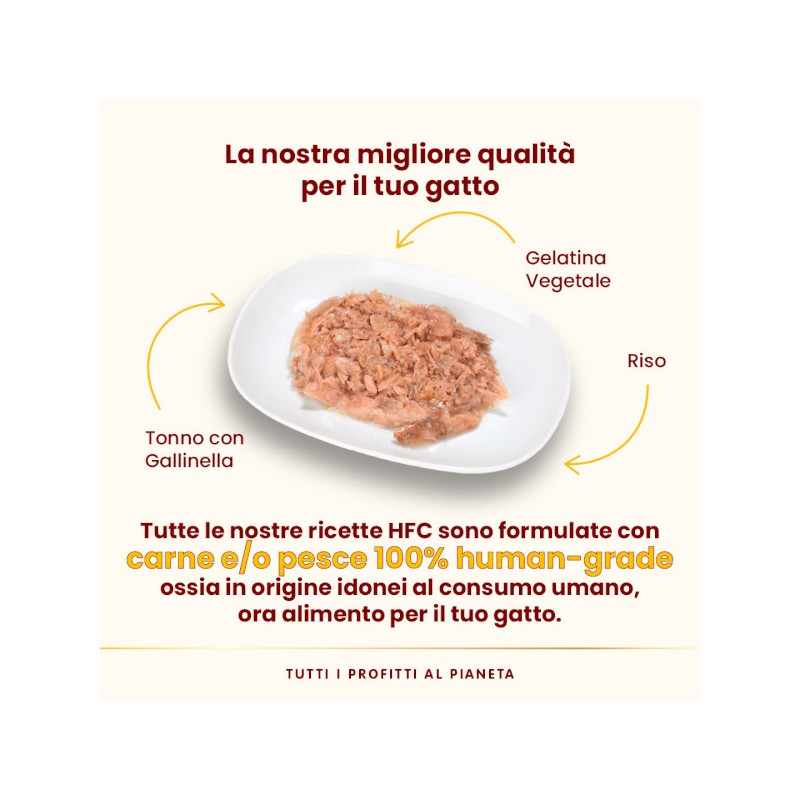 La linea HFC Jelly è preparata con ingredienti HFC, cioè in origine idonei al consumo umano e ora utilizzati nei nostri alimenti per gatti. La garanzia che sceglieresti per te. Una ampia gamma di alimenti umidi complementari preparati con carne o pesce HFC. Cucinate semplicemente in brodo, senza additivi chimici o coloranti, grazie alla loro gelatina vegetale costituiscono anche un aiuto per la rimozione dei boli di pelo. Almo Nature suggerisce di alternare le diverse fonti proteiche per assicurare una alimentazione varia e soddisfare i gusti di tutti i gatti, anche quelli più esigenti! La confezione in latta e l'etichetta in carta sono entrambe riciclabili e, se smaltite correttamente, possono essere riutilizzate come materia prima per altri imballi. HFC Jelly – deliziosi filettini di carne o pesce HFC in gelatina – disponibili in lattine da 70 g. Almo Nature è il brand attivista 100% proprietà della Fondazione Capellino.