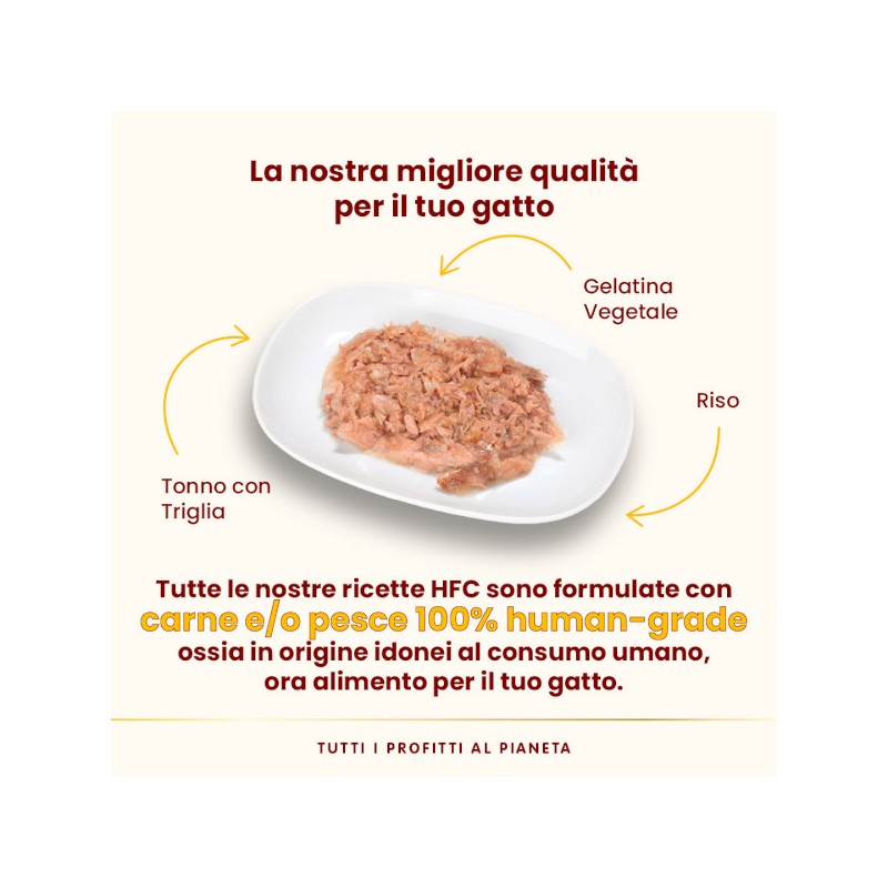 La linea HFC Jelly è preparata con ingredienti HFC, cioè in origine idonei al consumo umano e ora utilizzati nei nostri alimenti per gatti. La garanzia che sceglieresti per te. Una ampia gamma di alimenti umidi complementari preparati con carne o pesce HFC. Cucinate semplicemente in brodo, senza additivi chimici o coloranti, grazie alla loro gelatina vegetale costituiscono anche un aiuto per la rimozione dei boli di pelo. Almo Nature suggerisce di alternare le diverse fonti proteiche per assicurare una alimentazione varia e soddisfare i gusti di tutti i gatti, anche quelli più esigenti! La confezione in latta e l'etichetta in carta sono entrambe riciclabili e, se smaltite correttamente, possono essere riutilizzate come materia prima per altri imballi. HFC Jelly – deliziosi filettini di carne o pesce HFC in gelatina – disponibili in lattine da 70 g. Almo Nature è il brand attivista 100% proprietà della Fondazione Capellino.