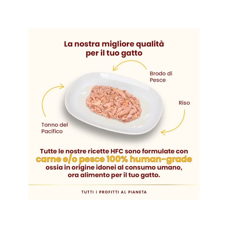 La linea HFC Natural è preparata con ingredienti HFC, cioè in origine idonei al consumo umano e ora utilizzati nei nostri alimenti per gatti. La garanzia che sceglieresti per te. Una ampia gamma di alimenti umidi complementari preparati con il 75% di carne o pesce HFC. Cucinate semplicemente in brodo di cottura, le ricette HFC Natural sono ideali per idratare naturalmente il tuo gatto. Almo Nature suggerisce di alternare le diverse fonti proteiche per assicurare una alimentazione varia e soddisfare i gusti di tutti i gatti, anche quelli più esigenti! La confezione in latta e l'etichetta in carta sono entrambe riciclabili e, se smaltite correttamente, possono essere riutilizzate come materia prima per altri imballi. HFC Natural – deliziosi filettini di carne o pesce HFC in brodo – disponibili in lattine da 70 g. Almo Nature è il brand attivista 100% proprietà della Fondazione Capellino.