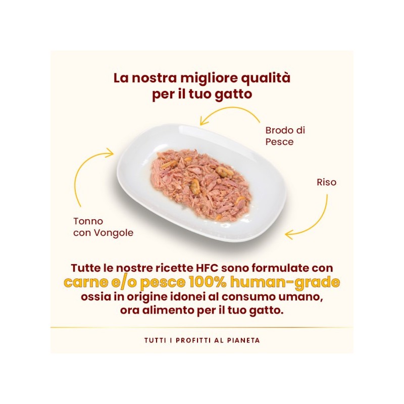 La linea HFC Natural è preparata con ingredienti HFC, cioè in origine idonei al consumo umano e ora utilizzati nei nostri alimenti per gatti. La garanzia che sceglieresti per te. Una ampia gamma di alimenti umidi complementari preparati con il 75% di carne o pesce HFC. Cucinate semplicemente in brodo di cottura, le ricette HFC Natural sono ideali per idratare naturalmente il tuo gatto. Almo Nature suggerisce di alternare le diverse fonti proteiche per assicurare una alimentazione varia e soddisfare i gusti di tutti i gatti, anche quelli più esigenti! La confezione in latta e l'etichetta in carta sono entrambe riciclabili e, se smaltite correttamente, possono essere riutilizzate come materia prima per altri imballi. HFC Natural – deliziosi filettini di carne o pesce HFC in brodo – disponibili in lattine da 70 g. Almo Nature è il brand attivista 100% proprietà della Fondazione Capellino.