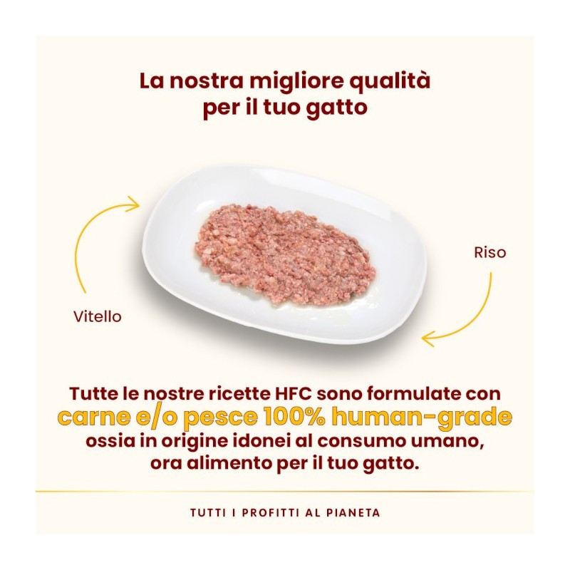 La linea HFC Natural è preparata con ingredienti HFC, cioè in origine idonei al consumo umano e ora utilizzati nei nostri alimenti per gatti. La garanzia che sceglieresti per te. Una ampia gamma di alimenti umidi complementari preparati con il 75% di carne o pesce HFC. Cucinate semplicemente in brodo di cottura, le ricette HFC Natural sono ideali per idratare naturalmente il tuo gatto. Almo Nature suggerisce di alternare le diverse fonti proteiche per assicurare una alimentazione varia e soddisfare i gusti di tutti i gatti, anche quelli più esigenti! La confezione in latta e l'etichetta in carta sono entrambe riciclabili e, se smaltite correttamente, possono essere riutilizzate come materia prima per altri imballi. HFC Natural – deliziosi filettini di carne o pesce HFC in brodo – disponibili in lattine da 70 g. Almo Nature è il brand attivista 100% proprietà della Fondazione Capellino.