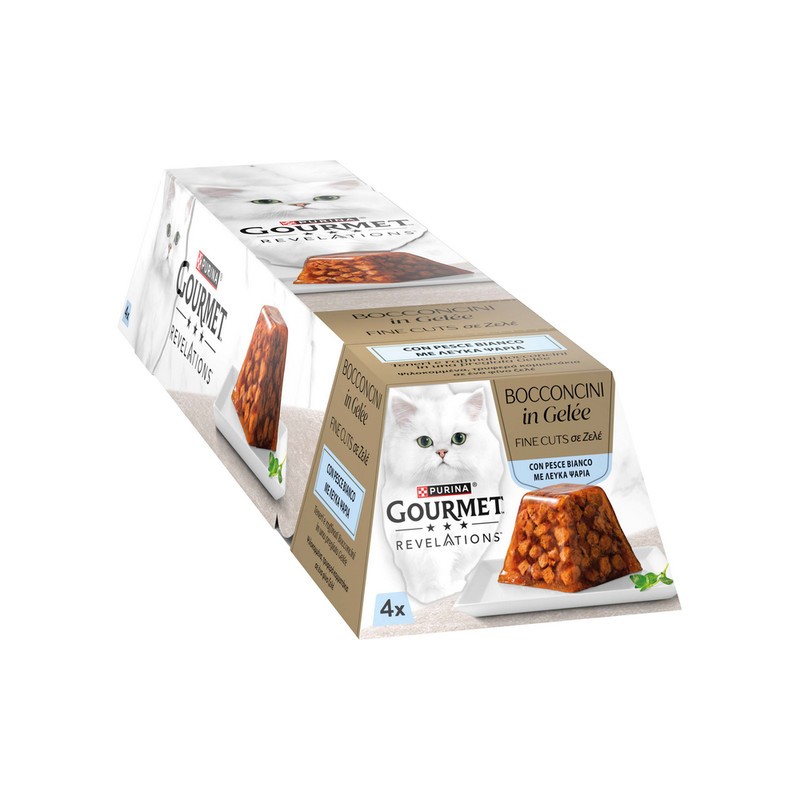 GOURMET™ REVELATIONS™ BOCCONCINI IN GELÉE, pensata per soddisfare i gatti che preferiscono mordere e masticare. Questa variante è caratterizzata da una delicata gelatina trasparente che avvolge i teneri bocconcini finemente tagliati. Il packaging di GOURMET™ REVELATIONS™ BOCCONCINI IN GELÉE unisce eleganza e funzionalità ed è pensato per rendere ogni pasto speciale per i gatti e comodo per chi se ne prende cura. Il design brevettato a forma di piramide garantisce un'esperienza di servizio premium e rende il pasto facile da servire grazie al sistema "easy release": basta capovolgere la confezione e premere leggermente sulla parte superiore della piramide per rilasciare il contenuto senza bisogno di posate e senza sprechi.