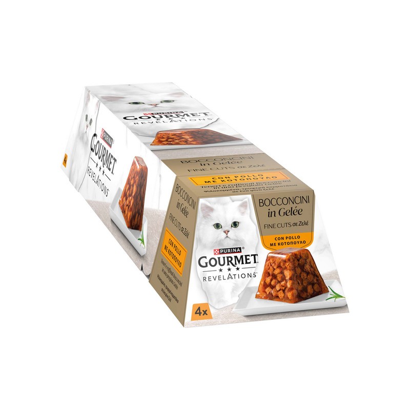 GOURMET™ REVELATIONS™ BOCCONCINI IN GELÉE, pensata per soddisfare i gatti che preferiscono mordere e masticare. Questa variante è caratterizzata da una delicata gelatina trasparente che avvolge i teneri bocconcini finemente tagliati. Il packaging di GOURMET™ REVELATIONS™ BOCCONCINI IN GELÉE unisce eleganza e funzionalità ed è pensato per rendere ogni pasto speciale per i gatti e comodo per chi se ne prende cura. Il design brevettato a forma di piramide garantisce un'esperienza di servizio premium e rende il pasto facile da servire grazie al sistema "easy release": basta capovolgere la confezione e premere leggermente sulla parte superiore della piramide per rilasciare il contenuto senza bisogno di posate e senza sprechi.
