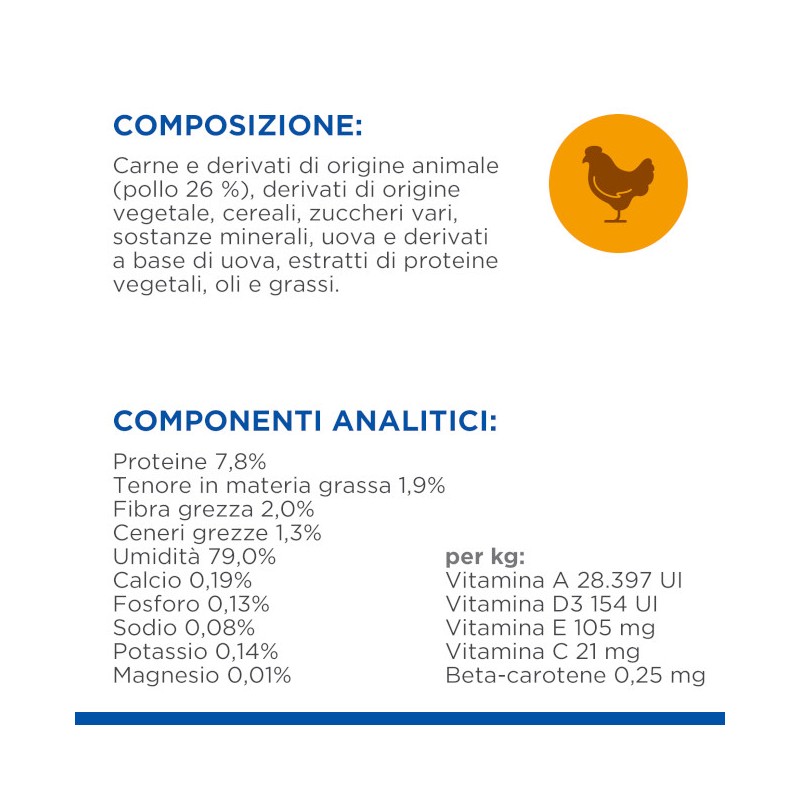 COMPOSIZIONE: Carne e derivati di origine animale, derivati di origine vegetale, cereali, zuccheri vari, sostanze minerali, uova e derivati a base di uova, estratti di proteine vegetali, oli e grassi.