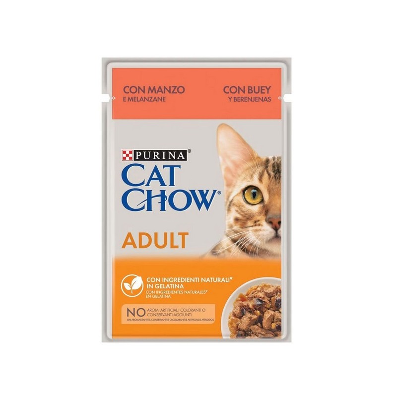 Cat Chow Adult, teneri pezzetti in gelatina con Manzo e Melanzane