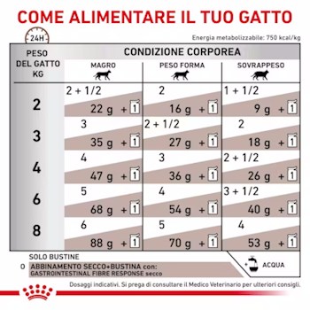 ROYAL CANIN® Gastrointestinal Fiber Response è specificamente formulato per aiutare a sostenere la salute dell'apparato digerente del tuo gatto per la compensazione della cattiva digestione o sensibilità gastrointestinali simili. Questo alimento possiede una composizione specifica (compreso un alto contenuto di psyllium) per aiutare a mantenere la salute del transito intestinale. Questa dieta è formulata con un adeguato contenuto energetico per favorire il mantenimento del peso forma. Composizione specifica (compreso un alto contenuto di psyllium) per aiutare a mantenere la salute del transito intestinale. Questo alimento è formulato per favorire la salute dell’ambiente urinario. Come parte della gamma GastrointestinalROYAL CANIN®, è importante che questo prodotto venga somministrato al tuo animale domestico solo su consiglio di un medico veterinario. La transizione del tuo animale domestico da una dieta all'altra dovrebbe essere un processo lento e graduale nell'arco di un periodo di 7-10 giorni. Assicurati di seguire la corretta quantità di razionamento, specialmente durante l'alimentazione mista. Per soddisfare le preferenze individuali di ogni gatto, ROYAL CANIN® Gastrointestinal Fiber Response è disponibile anche come alimento secco con crocchette * *Soggetto a disponibilità del prodotto