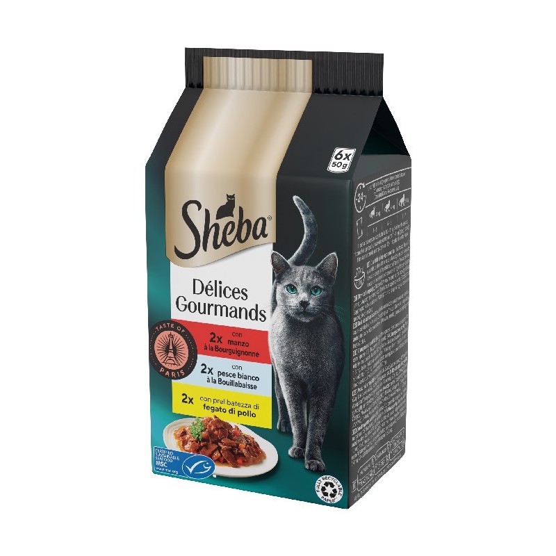 Alimento umido per gatti adulti Sheba Fresh Cuisine Taste of Paris, 2 varianti (manzo e pesce bianco) in salsa, con pesce al 100% da pesca sostenibile, in buste monoporzione (50 g) pratiche da servire.