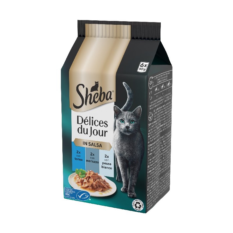 Sheba Delice Du Jour Salsa Tonno e Merluzzo è disponibile in 6 pratiche bustine salva freschezza, ognuna da 50 gr.