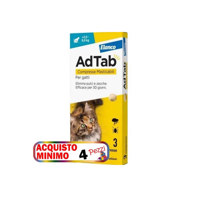 AdTab è una compressa aromatizzata per gatti, masticabile e di piccole dimensioni, che elimina pulci e zecche per un mese intero. AdTab agisce rapidamente, eliminando le infestazioni esistenti e le nuove infestazioni di pulci e zecche. Elimina le pulci prima che possano deporre le uova e previene la contaminazione della casa dalle pulci, nelle aree dove l’animale ha accesso. AdTab è facile da somministrare grazie alle compresse aromatizzate di piccole dimensioni.