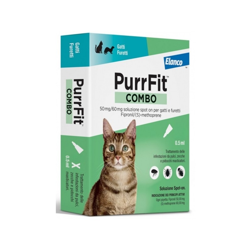 PurrFit Combo è un medicinale veterinario: chiedi consiglio al tuo veterinario. Leggere attentamente il foglio illustrativo. Tenere fuori dalla portata dei bambini ed usare particolare attenzione finché il sito di applicazione non sia asciutto. L’uso scorretto può essere nocivo. Adatto anche per gattini dalle 8 settimane di vita e per furetti dai 6 mesi di vita. NON USARE SUI CONIGLI.