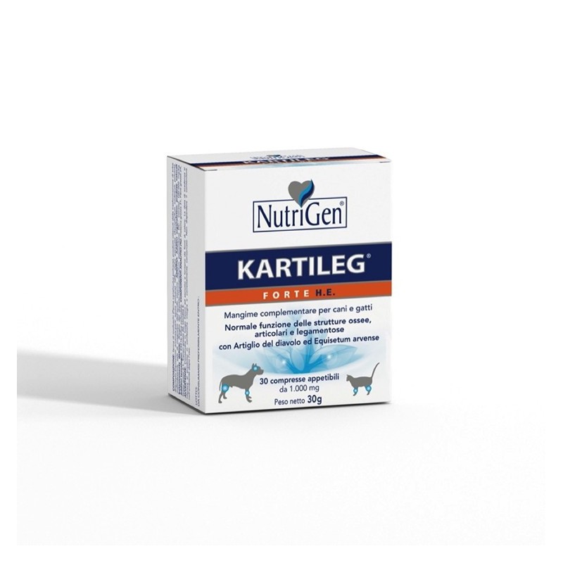 KARTILEG® FORTE H.E. è un mangime complementare per cani e gatti formulato in compresse appetibili con Artiglio del diavolo ed Equiseto, fonte naturale di minerali, utile per favorire la normale funzione delle strutture ossee, articolari e legamentose. KARTILEG FORTE H.E. risulta indicato come integrazione nutrizionale in animali atleti o soggetti ad attività sportiva.