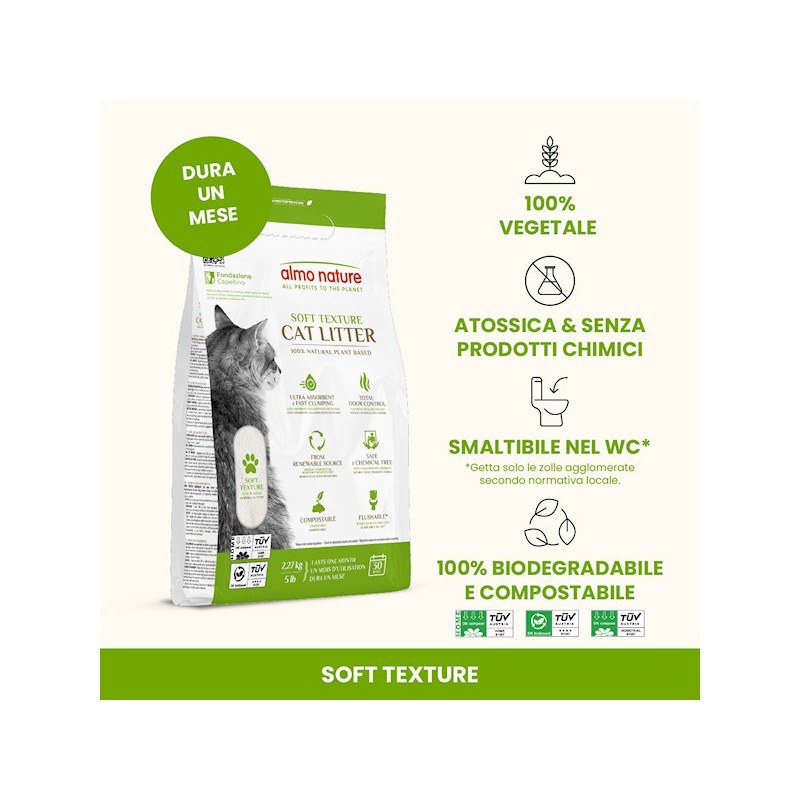 Almo Nature CatLitter è una lettiera per gatti completamente naturale a base di fibre vegetali, biodegradabile, compostabile e smaltibile nel WC. L’amido contenuto nelle fibre vegetali agglomera velocemente mentre gli enzimi neutralizzano i cattivi odori.