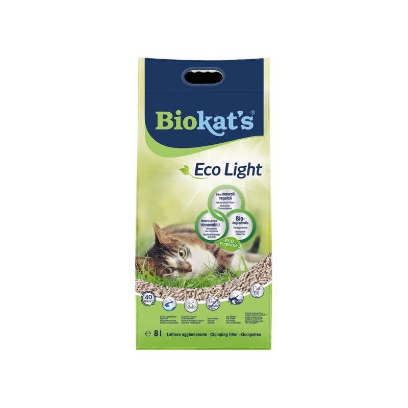 I nostri pellet sono costituiti da fibre vegetali e sono quindi estremamente assorbenti. Lo strato base utilizzato per la toilette del gatto può durare da 4 a 6 settimane. La durata di questa confezione è indicata sul fronte. I cattivi odori restano intrappolati a lungo nella particolare struttura tubolare delle nostre fibre vegetali. Lo sviluppo degli odori viene così bloccato in maneira duratura. Biokat's Eco Light è una lettiera agglomerante naturale prodotta con fibre vegetali che agiscono come una spugna. I liquidi vengono assorbiti completamente. Si formano agglomerati in cui vengono intrappolati sia i liquidi che gli odori. Biokat’s Eco Light pesa fino al 50% in meno rispetto a lettiere per gatti simili in argilla naturale. Ecco perché questo prodotto è così leggero da trasportare.