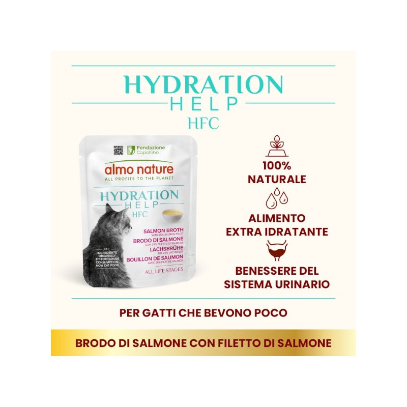 Il gatto tende a bere poco, Hydration Help HFC contribuisce alla sua idratazione e al benessere dell'apparato urinario. È un'integrazione ideale per l'alimentazione dei gatti di tutte le taglie ed età, anche sterilizzati. Con ingredienti in origine idonei al consumo umano ora alimento per gatti per scelta commerciale. Almo Nature suggerisce di alternare le diverse fonti proteiche per assicurare una alimentazione varia e soddisfare i gusti di tutti i gatti, anche quelli più esigenti! La bustina poliaccoppiata di plastica ed alluminio, scelta per la corretta conservazione del prodotto, se smaltita correttamente può essere riutilizzata per produrre energia. Hydration Help HFC – disponibile in bustine da 50 g. Almo Nature è il brand attivista 100% proprietà della Fondazione Capellino.
