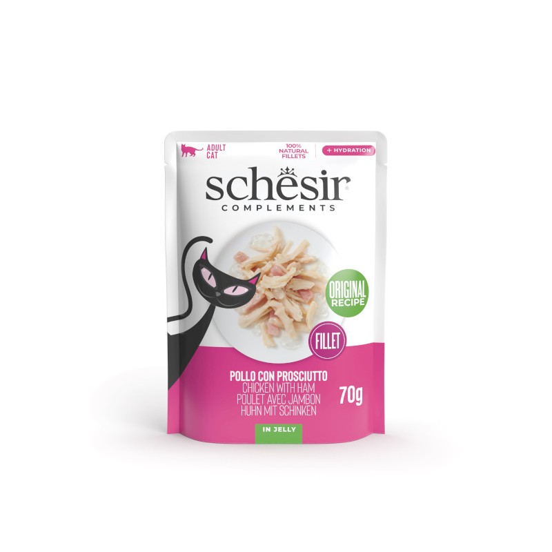 Schesir Complements Alimento Umido per gatti Pollo con prosciutto filetti in jelly 70g busta