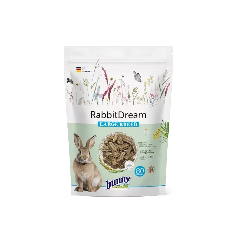 Sogno per Conigli LARGE BREED è perfettamente equilibrato. Può essere fornito a volontà (ad lib). Ciò significa: riempire la ciotola, lasciarla svuotare e solo dopo riempirla di nuovo. In questo modo, gli animali possono coprire al meglio il loro fabbisogno.
