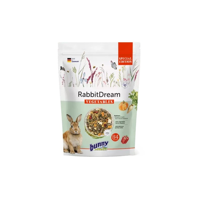 Sogno per Conigli SPECIAL EDITION VEGETABLES offre una miscela armoniosa di 63 piante ed erbe provenienti da prati non trattati, arricchita con verdure ricche di vitamine e deliziosi gambi di prezzemolo. La ricetta bilanciata a lunga conservazione, la miscela di 3 fibre e il rapporto ottimale fibra grezza/amido favoriscono la salute di pelle, pelo, denti e ossa.